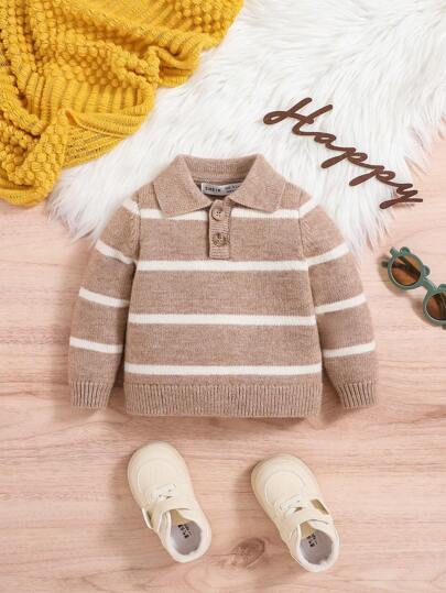 SHEIN Leap Crew Baby Boy Striped Pattern Polo Neck Sweater - Khaki - View 1