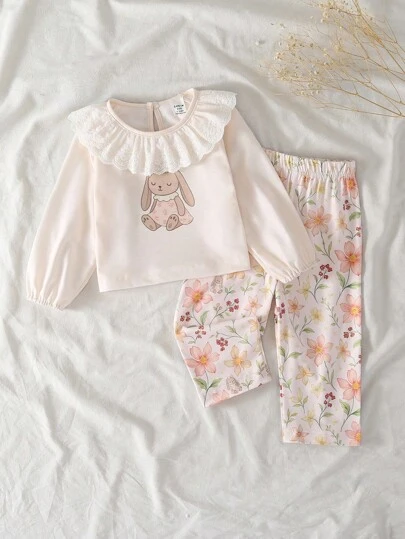 SHEIN Baby Girl Cartoon Rabbit Print Long Sleeve Ruffle Hem T-Shirt And Floral Print Pants Set Baby Girl Two Piece Set Fall Winter - Multicolor - View 1