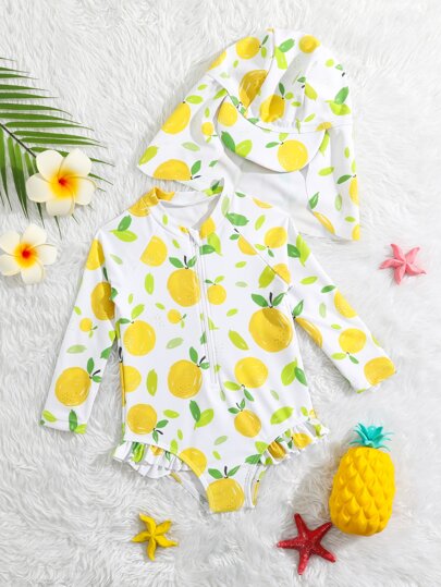 SHEIN Baby Girl Fruit Print Ruffle Trim Zipper Front One Piece Swimsuit With Hat - White - View 1