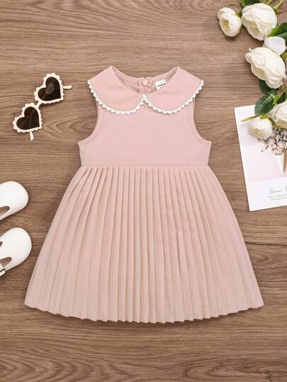 SHEIN Baby Girl Peter Pan Collar Lace Detail Pleated Hem Dress - Pink - View 1