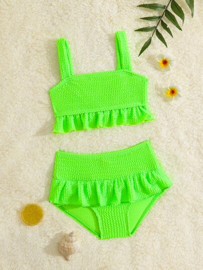 SHEIN Baby Girl Summer Beach Ruffle Hem Textured Neon Beachwear Bathing Suit - Lime Green - View 1