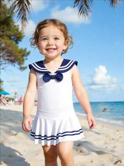SHEIN Baby Girls Beachwear  And Child Two Piece Set, Navy Collar, Three Dimensional Folded Skirt, Breathable Knitted Fabric Swimsuit, Beach, Pool, Seaside, Surfing Vacation, Summer, Travel, Vacation Baby Girl Swimsuit Two Piece Baby Bathing Suit 2 Piece Baby Sailor Outfit Baby Beach Outfits Baby Girl Beach Wear - White - View 1