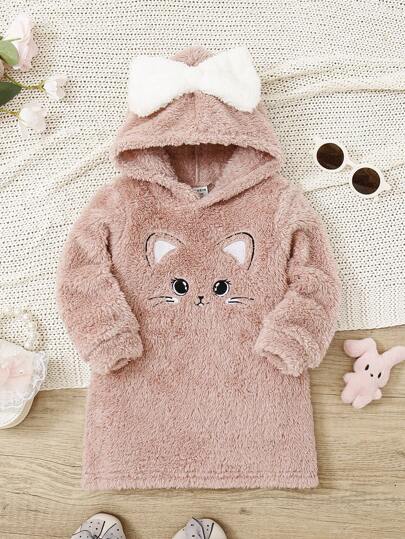 SHEIN Baby Girls' Casual Cat Embroidery Hooded Dress With Thermal Lined - Pink - View 1