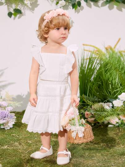 SHEIN Baby Lace Insert Ruffle Trim Top & Skirt - White - View 1
