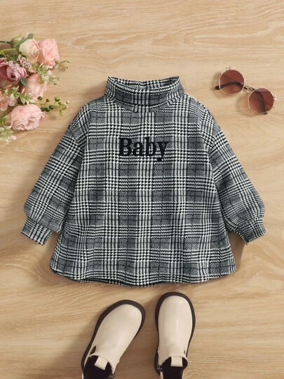 SHEIN Baby Letter and Houndstooth Pattern Funnel Neck Pullover - Black and White - View 1