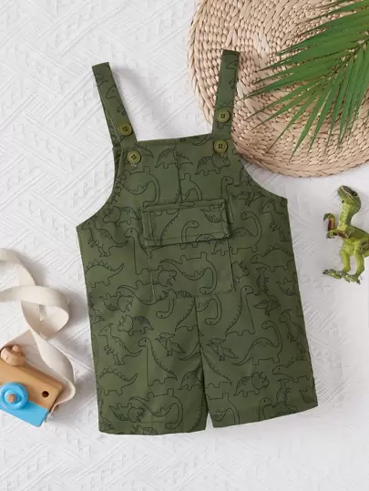 SHEIN Baby Dinosaur Print Flap Pocket Overall Romper - Army Green - View 1