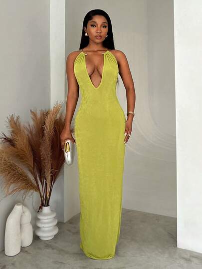 SHEIN BamGlam Sexy Temperament Backless Deep V-Neck Long Dress - Olive Green - View 1