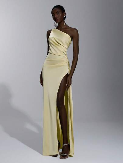 SHEIN Belle Elegant, Romantic, Sexy, Minimalist Sleeveless Backless Ruffle Trim Bodycon Dress With High Slit, In Light Yellow Satin Fabric, Suitable For Fashion, Influencer Style, Holidays, Vacation, Birthday Party, Wedding, Bridesmaid - Yellow - View 1