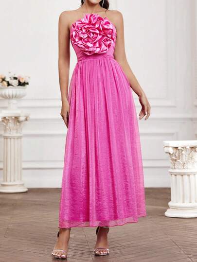 SHEIN Belle Spring/Summer Solid Color Lace Trim Pleated Strapless Dress For Women - Hot Pink - View 3
