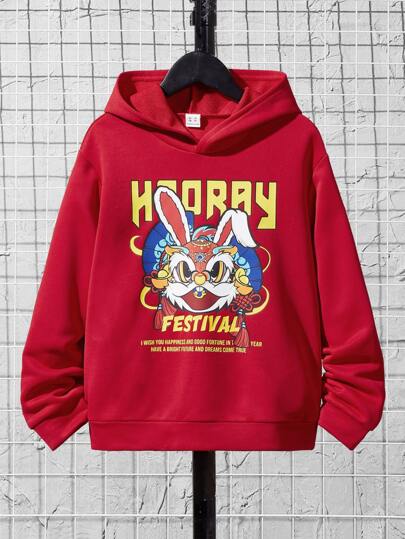 SHEIN Tween Boy Rabbit & Slogan Graphic Drop Shoulder Sweatshirt - Red - View 1