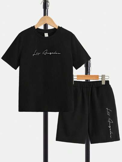 SHEIN Boys Letter Graphic Tee & Shorts - Black - View 1