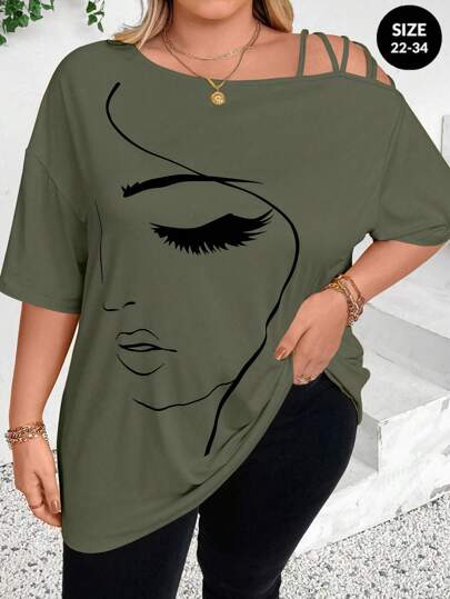 SHEIN CURVE+ Plus Size Women Summer Abstract Face Print Asymmetric Neck Loose Casual T-Shirt Graphic Tees Women Tops - Army Green - View 1