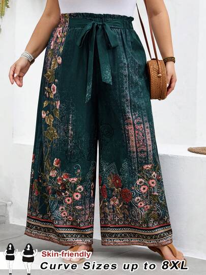 SHEIN CURVE+ Plus Size Women's Flower Green Pattern, Retro, Waist Pants, Pretending To Be A Lady, Spring And Summer, Seaside Vacation, Party, Autumn Women's Clothing, Old Money, Wedding, Graduation Trip, Gift For Mom, Bohemian Women's Waist Strap Pants Suitable For Spring And Summer - Multicolor - View 1