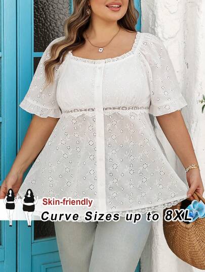 SHEIN CURVE+ Plus Size Women's Square Collar, Black Fungus Edge, Short Sleeved Lace Splicing, Pressure Strip, Waist Cinching, A-List Shirt, Embroidered Jacquard Texture Fabric, Casual, Relaxed, Elegant Commuting, Old Money Style Women's Shirt, Doll Shirt - White - View 1