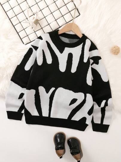 SHEIN Casual Street Style Contrast Color Printed Tween Boys' Crewneck Pullover Sweater - Black and White - View 1