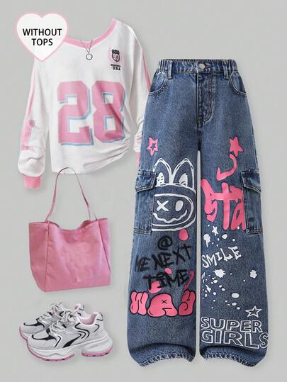 SHEIN ChillGRL Girls' New Fashion Sweet Heart Embroidery Straight Leg Loose Fit Jeans - Medium Wash - View 1