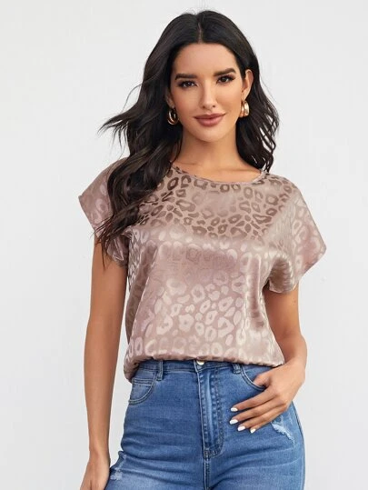 SHEIN Clasi Dolman Sleeve Leopard Jacquard Satin Top - Dusty Pink - View 1