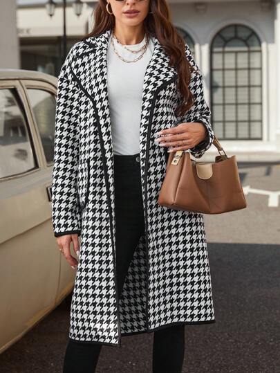 SHEIN Clasi Houndstooth Print Drop Shoulder Overcoat - Black and White - View 1