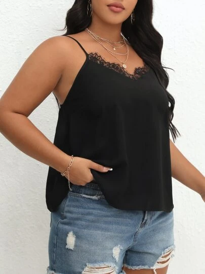 SHEIN VCAY Plus Eyelash Lace Trim Cami Top - Black - View 1
