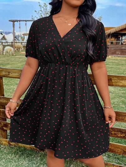 SHEIN Clasi Plus Heart Print Overlap Collar Dress, Summer - Black - View 1