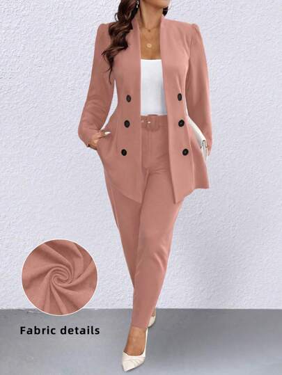 SHEIN Clasi Plus Size Solid Color Double-Breasted Suit Jacket And Pants Set Graduation,Back To School,Teacher Outfits For Women Fall Cloth For Women Autumn - Pink - View 1