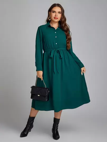 SHEIN Clasi Plus Solid Belted Shirt Dress - Green - View 1