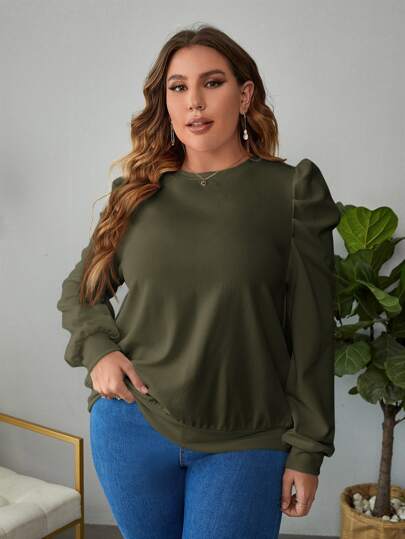 SHEIN Clasi Plus Solid Puff Sleeve Sweatshirt - Army Green - View 1