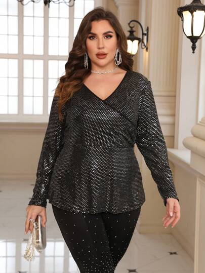 SHEIN Clasi Plus Surplice Neck Sequin Wrap Front Tee - Black - View 1