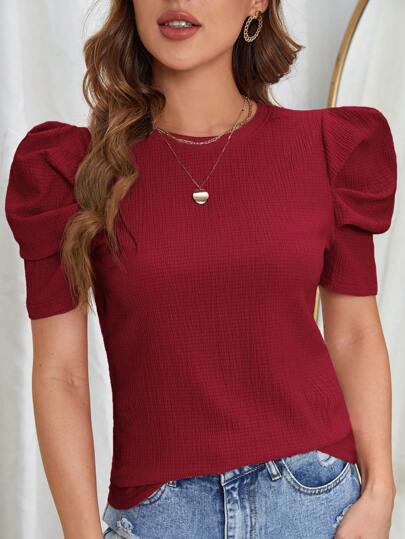SHEIN Clasi Puff Sleeve Solid Tee - Burgundy - View 1