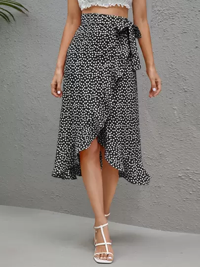 SHEIN Clasi Ruffle Trim Wrap Knot Side Skirt - Black - View 1