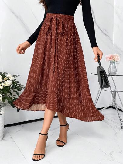 SHEIN Clasi Women's Polka Dot Print Belted Skirt With Ruffle Hem - Coffee Brown - View 1