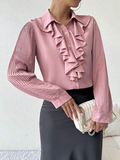 SHEIN Clasi Women's Solid Color Ruffled Front Button Long Sleeve Blouse Fall Cloth For Women - Pink - View 1