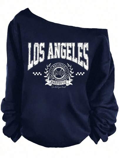 SHEIN EZwear Casual College Style Deep Navy California Graphic Loose Off Shoulder Thick Hoodie Sweatshirt Back To School Fall And Winter Clothing Autumn And Winter - Navy Blue - View 1