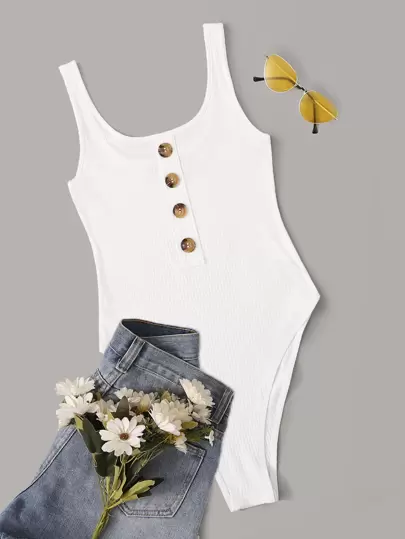 SHEIN EZwear Button Front Rib-knit Tank Bodysuit - White - View 1