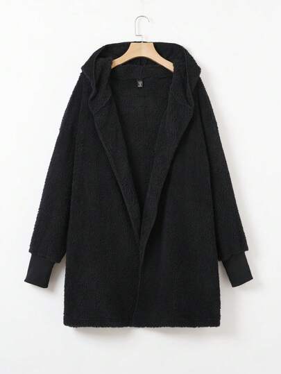 SHEIN EZwear Plus Drop Shoulder Hooded Teddy Coat - Black - View 1