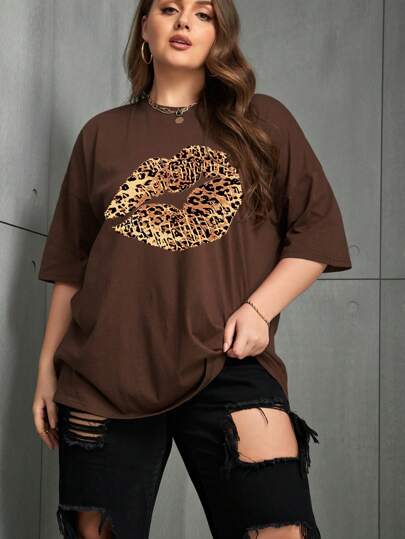 INAWLY Plus Size Leopard Lip Print Drop Shoulder Tee - Chocolate Brown - View 1