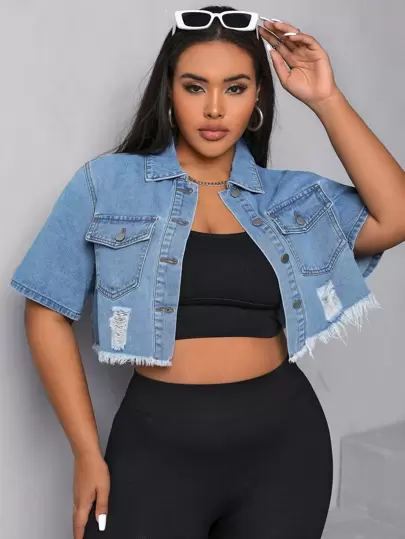 SHEIN EZwear Plus Ripped Raw Cut Crop Denim Jacket - Light Wash - View 1