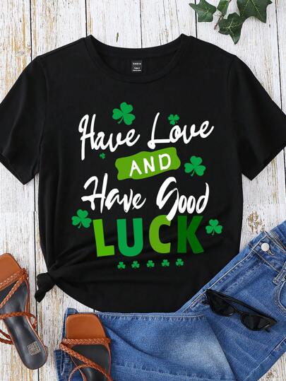 SHEIN EZwear Plus Size Casual Shamrock Slogan Saint Patrick's Day Printed Short Sleeve T-Shirt - Black - View 1