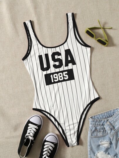 SHEIN EZwear Striped & Letter Graphic Contrast Binding Bodysuit - Black - View 1