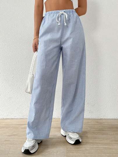 SHEIN EZwear Striped Women's Linen Low Rise Pants, Summer Vacation - Blue and White - View 1