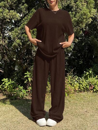 SHEIN EZwear Summer Knit Textured Loose T-Shirt And Wide Leg Pants Set - Brown - View 1