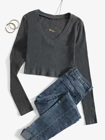 SHEIN EZwear V Neck Rib-knit Crop Top - Dark Grey - View 1