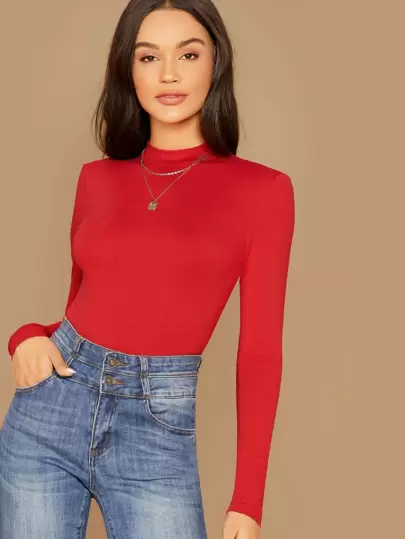 SHEIN Essnce Form-Fitting Mock Neck Top - Red - View 1