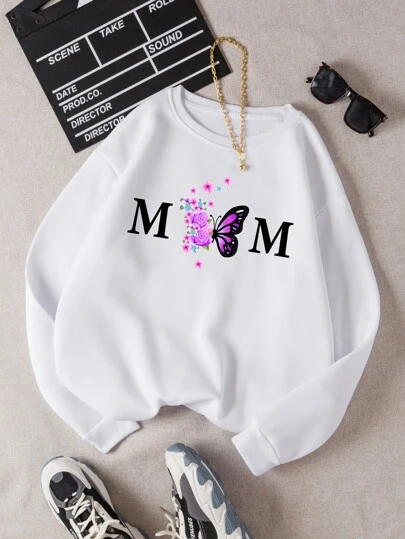 INAWLY Letter & Butterfly Print Thermal Pullover - White - View 1