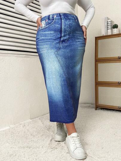SHEIN Essnce Plus Size Spring/Summer Casual Denim Effect Skirt - Navy Blue - View 1