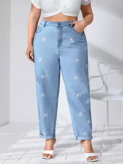 SHEIN Essnce Plus Floral Embroidery Slant Pocket Mom Fit Jeans - Light Wash - View 1