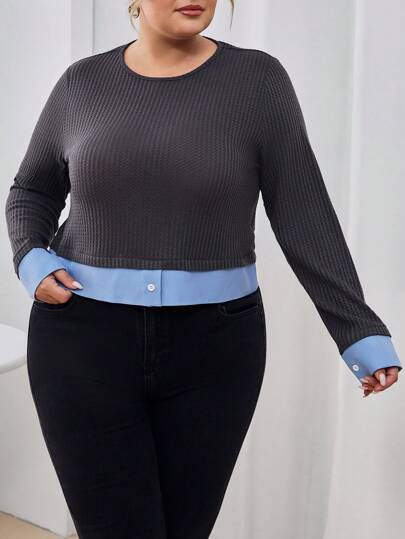 SHEIN Essnce Plus Size Plaid Hem Patchwork T-shirt - Multicolor - View 1