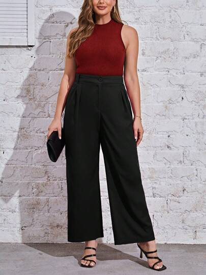 SHEIN Essnce Plus Solid Wide Leg Pants - Black - View 1