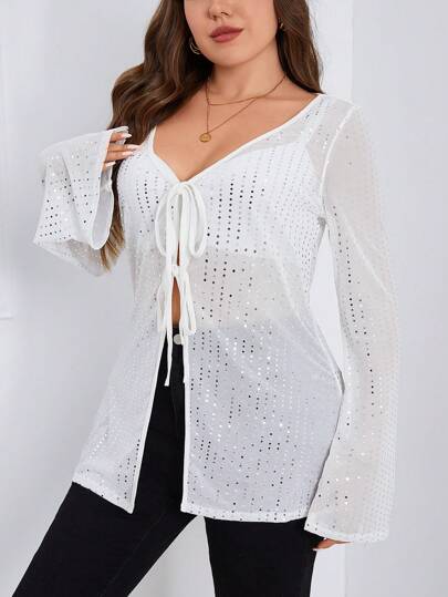 SHEIN Essnce Plus Tie Front Trumpet Sleeve Sequin Top Without Bra - White - View 1