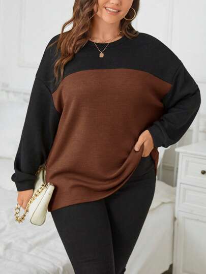 SHEIN Essnce Plus Two Tone Drop Shoulder Tee - Coffee Brown - View 1